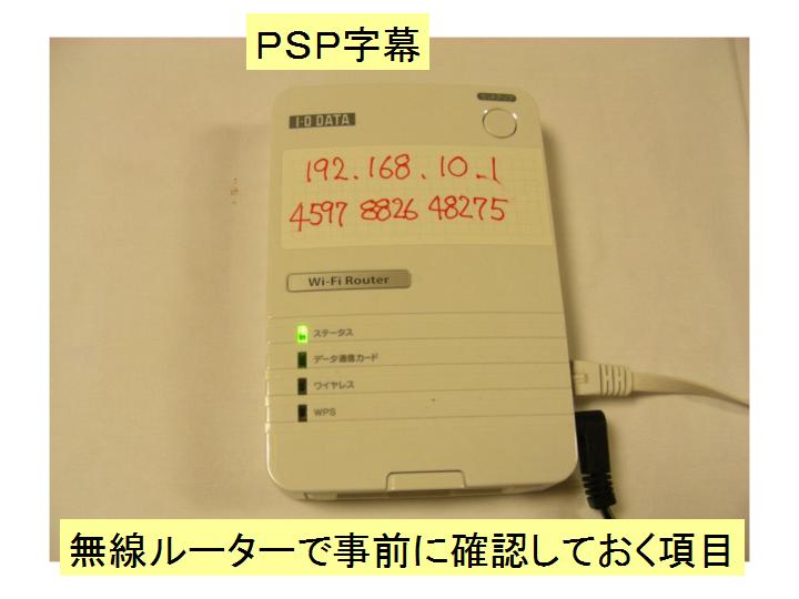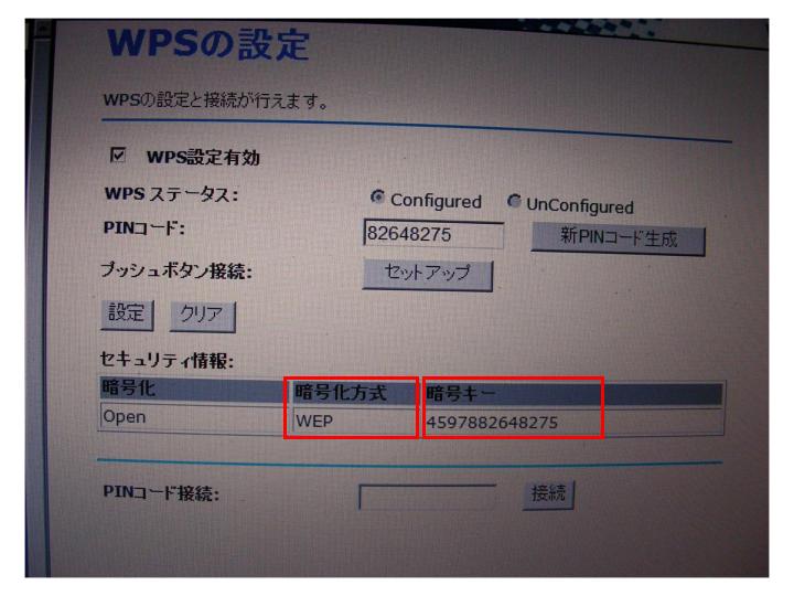 | 3) 暗号化方法と暗号化キーを調べます。 以上で、ルーターで調べることは終わりです。 ★無線ルータは、電源を入れたままにして、PSPからアクセスできるようにしておいてください。 |