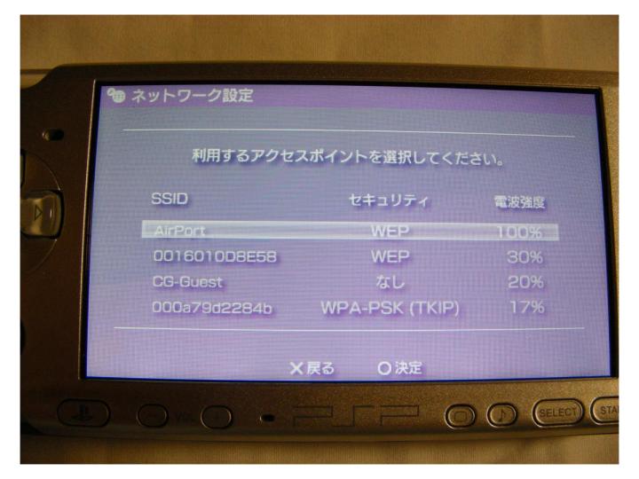 | 9) PSPが無線ルーターを探して、一覧を出します。 隣の家の無線ルーターなども表示されます。 PSPの横に無線ルーターを置いておけば、「電波強度」が一番強いのが、その無線ルーターです。 「SSID」「セキュリティー」が、2)3)で調べたものと同じか確認してください。 接続したい無線ルータを選択します。 |