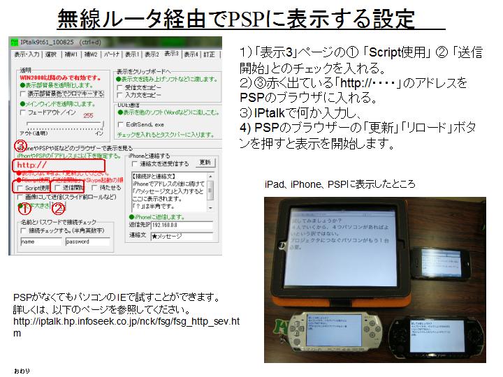 | 30) IPtalkで何か入力するとPSPに表示されます。 |