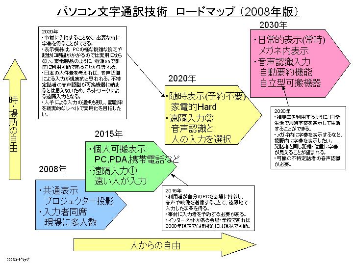 | ★このロードマップは、議論途中の案です。 NCKが目指している最終目標は、「いつでもどこでも必要な時に」「他の人に頼ることなく」パソコン文字通訳を利用できるようになることです。 上の図は、それに至るロードマップです。 縦軸は、「時・場所からの自由」、つまり、「いつでもどこでも」の自由度です。 横軸は、「人からの自由」、つまり、「他の人に頼ることなく」の自由度です。 1)2008年現在 パソコン要約筆記の現場には、多数の入力者が集まり入力しています。表示は、プロジェクターでスクリーン投影する表示を全員が見るのが一般的です。 関係者の努力にもかかわらず、自由度という観点からは、現状はあまり良いとは言えません。 2)2015年 ・利用者が自分のPCを会場に持参し、音声や映像を送信することで、遠隔地で入力した字幕を得る。 ・事前に入力者を予約する必要がある。 ・インターネットがある会場・学校であれば2008年現在でも技術的には現状で可能。 2020年 ・事前に予約することなく、必要な時に字幕を得ることができる。 ・表示機器は、PCの様な複雑な設定や起動に時間がかかるのでは実用にならない。 家電製品のように、電源onで即座に利用可能であることが望まれる。 ・日本の人件費を考えれば、音声認識による入力が現実的と思われる。 不特定話者の音声認識が可搬機器に納まるとは思えないため、ネットワークによる遠隔入力となる。 ・人手による入力の選択も残し、認識率を現実的なレベルで実用化を目指したい。 2030年 ・補聴器を利用するように、日常生活で常時字幕を表示して生活することができる。 ・メガネ内に字幕を表示するなど、視野内に字幕を表示したい。 発話者と同じ距離・位置に字幕が見えることが望まれる。 ・可搬の不特定話者の音声認識が必要。 |